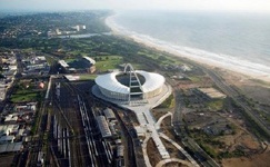 Moses Mabhida Stadium Durban received an impressive new football stadium for the 2010 Fifa World Cup. The Moses Mabhida Stadium with its impressive arch became an eye-catching addition to the city's fine list of sporting facilities. Situated within walking distance of the Absa Stadium, home to the Sharks and a popular rugby test venue, the Moses Mabhida Stadium had a capacity of 62 760 during the World Cup, but that was reduced to 54 000 afterwards. The stadium has the capacity, however, to accommodate 80 000, if needed. There are 150 corporate hospitality suites with 7 500 seats. The 106-metre high grand arch is not just a design feature. A cable car takes visitors up to its highest point, where they can get out and enjoy breathtaking, panoramic views of the city and ocean. The roof is made of Teflon®-coated glass fibre membranes, which produce a translucent glow when the stadium is lit. Seven Fifa World Cup matches were played at the stadium: five first round games, a second round fixture, and a semi-final. Since the World Cup, the ground has also hosted a T20 international between South Africa and India and many concerts. With its spectacular arch and big capacity, it dominates the city's seaside sporting skykline, including the nearby Absa Stadium.