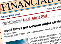 The lead article, "Good times put system under strain", uses the example of traffic congestion on the highway between Johannesburg and Pretoria to make its point: that the country's unprecedented prosperity and economic growth is challenging its infrastructure.